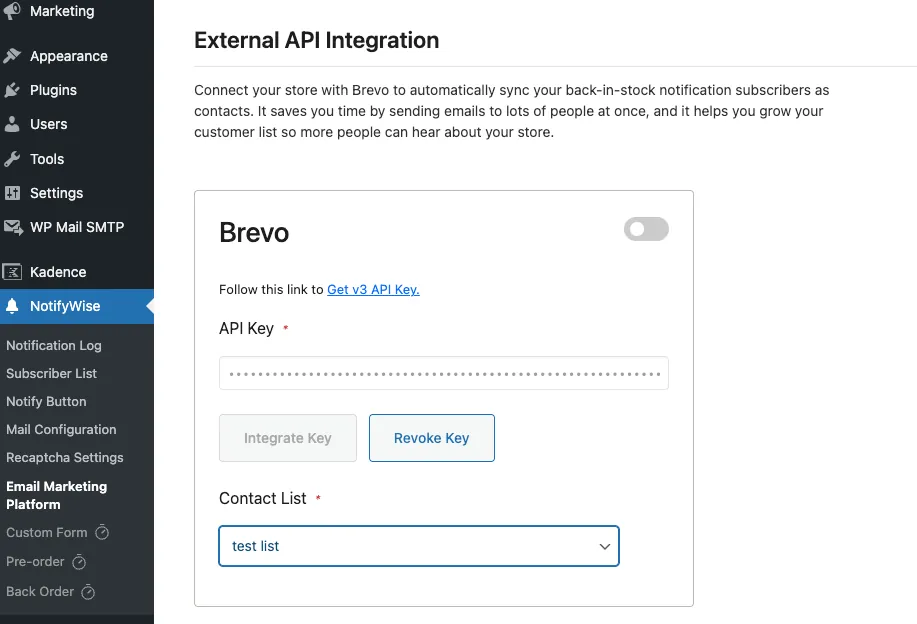 5. Set Brevo credentials to collect subscription contact to a list from NotifyWise > Email Marketing Platform.