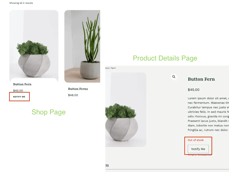 The button automatically appears on out-of-stock products and product details pages. Customers can subscribe, and the plugin will notify them when the product is available.