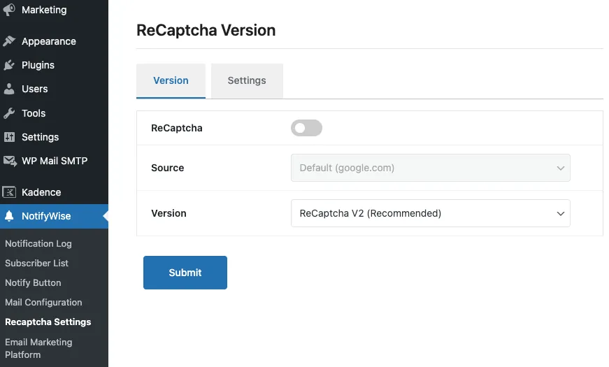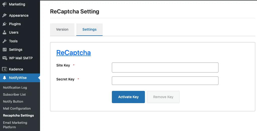 4. Setup reCaptcha credentials to secure the subscription form from NotifyWise > Recaptcha Settings.